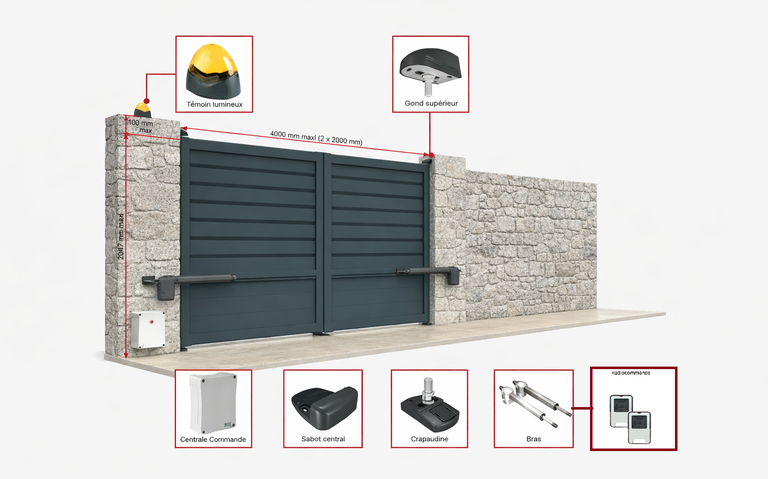 Accessoires fournis et mise en situation du portail battant Alia Productions