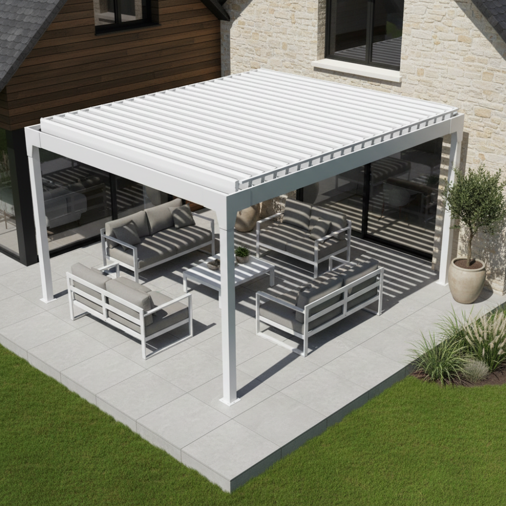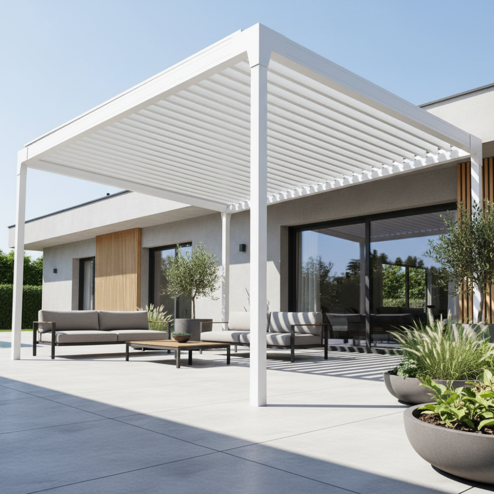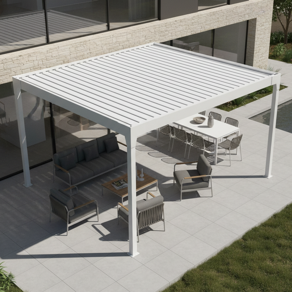 C'est le pergola bioclimatique d'assez grande dimension avec lames à double paroi et une maneuvre 1 vérin/module.