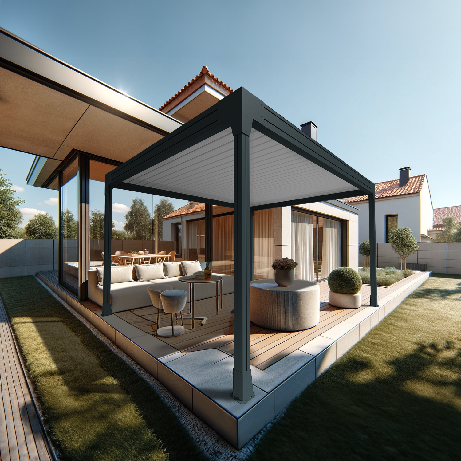 C'est la pergola bioclimatique de grande dimension avec lames à double paroi et une manœuvre 2 vérins.